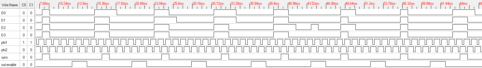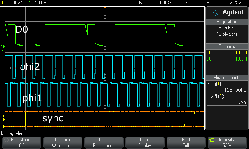 I had to remove the 10 k series resistors for phi1 and phi2, because the rise and fall time was too slow, but it is not needed anyway. This is a detail scope image of the clock signals: