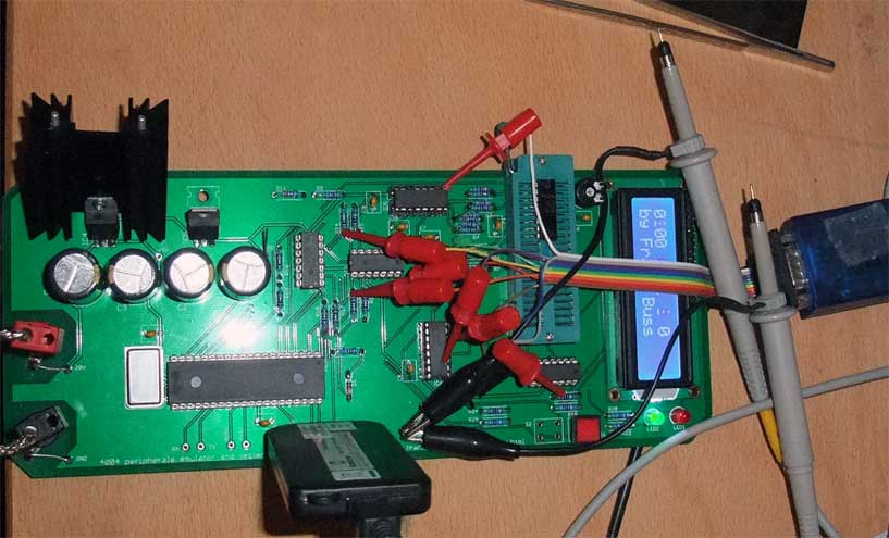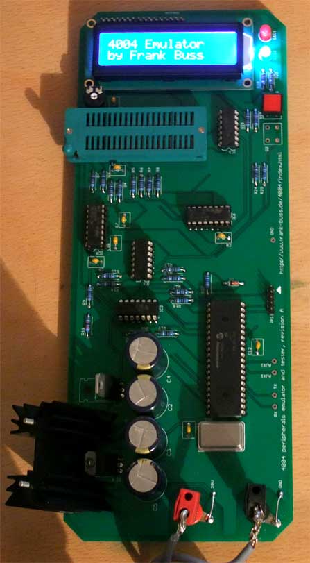 I got the PCB today (I ordered it 11 days ago from ITeadStudio, shipping with UPS is really fast), very good quality. All components are soldered, after fixing the problem with the wrong footprint for the trimmer with some wires. The 5 V linear regulator gets a bit hot, because I need 20 V for the 15 V regulator and currently it needs 100 mA, but with a big heatsink it gets just lukewarm. Another problem is with the green LED: it is not easy to see because of the illumination of the display backlight. Maybe I should use some electrical tape, if it doesn't get too hot. The PIC16F887 is working and I can show something on the display and the red LED is blinking. Now the fun starts: writing the emulator for the peripherals of the 4004 and verifying the signals in single step mode (with the key), then placing the 4004 in the ZIF socket.