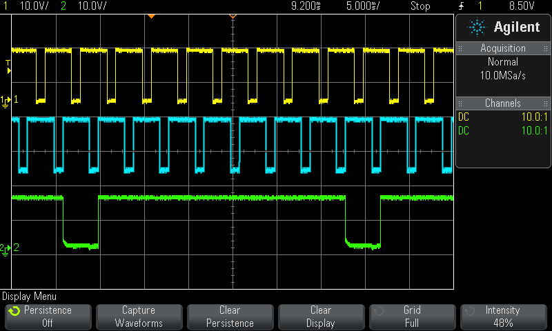 The 4004 is alive! The yellow and cyan traces are the phi1 and phi2 signals, generated by the PIC and the green signal is the sync response, generated by the 4004 CPU: