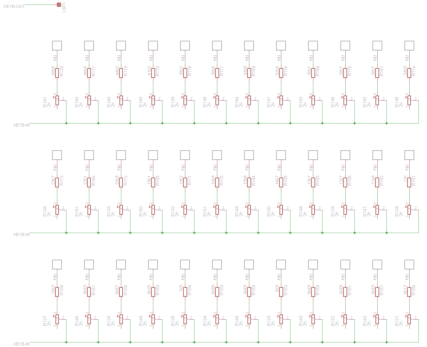 For my setup I've measured that the required resistance R per key is R=1/f/(1.45*C2)-R7 (with f=the frequency of the key, R7=1860 and C2=1e-7). Maybe your setup may vary, so some resistor kits are useful, like this one from Digikey with 0805 SMD resistors, or you could use two pots per note, one for coarse and one for fine tuning. You'll need at least a pot per note for fine tuning, otherwise it can sound very out of tune with 1% E96 resistor values.