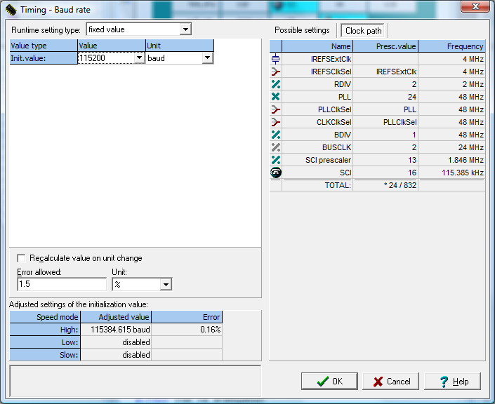 Für einige Dinge, wie die Timer-Konfiguration oder den Baudrate-Generator gibt es Wizards, bei denen man nur die gewünschte Frequenz vorgibt und die dann alle benötigten Registerwerte ausrechnen und den Frequenzfehler anzeigen. Nützlich hierbei auch die Clock-Path Anzeige, bei der übersichtlich dargestellt wird, durch welche Teiler und sonstige Stufen der Takt läuft, um die Baudrate zu generieren: