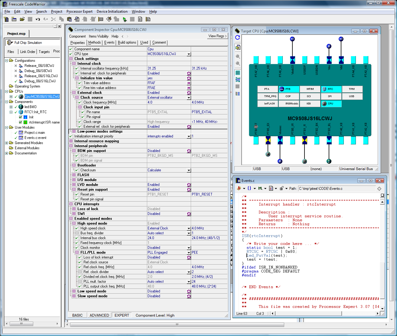 Als Entwicklungsumgebung gibt es die CodeWarrior Development Suite - Special, wobei man die HCS08/ColdFire-Version braucht. Ist eine abgespeckte Version, die für C Code auf 32 kB Code-Größe begrenzt ist, was aber kein Problem bei maximal 16 kB Flash ist. Damit kann man recht leicht ein Projekt mit dem "Processor Expert" erstellen, was ein ähnliches Konzept wie der Cypress PSoC Designer verfolgt: Man kann in der IDE Software und Hardware Module hinzufügen und per GUI konfigurieren. Daraus wird dann C Code generiert, der die Hardware initialisiert und Stellen freiläßt, an denen man seine Implementierung schreiben kann.