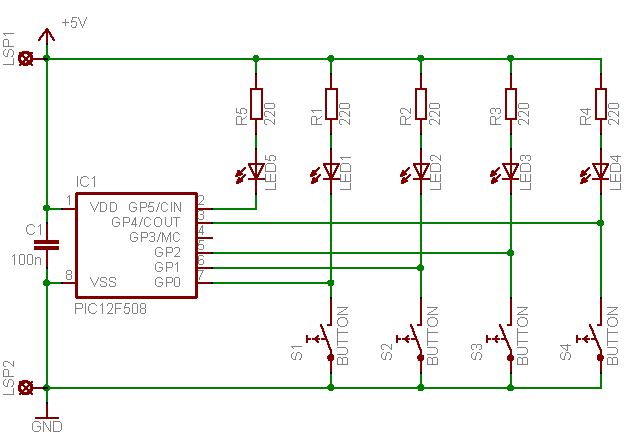This is an impulse generator, which creates every 2 min, 5 min, 10 min or 25 min an impulse of one second (displayed on LED5). The delay between the pulses is selected with the buttons S1 to S4 and displayed with LED1-4: Every 1/15625s the buttons are sampled and the next 124/15625s the GPIOs are set to output to display the selected delay with the LEDs.