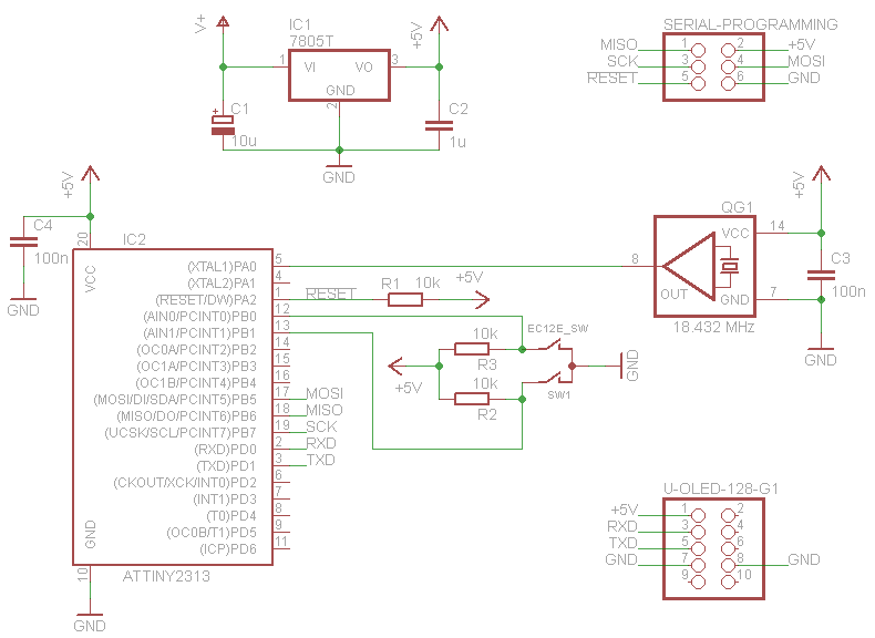 Hier ein kleiner Test des ATtiny2313 mit dem µOLED-128-G1 von 4D Systems. Man kann das OLED-Display in Deutschland von TinkerSoup für 39 Euro kaufen. Angeschlossen ist ein Drehgeber mit Quadraturausgang von ALPS, Typenbezeichnung EC12E2420404, mit 24 Rasterungen pro Umdrehung.