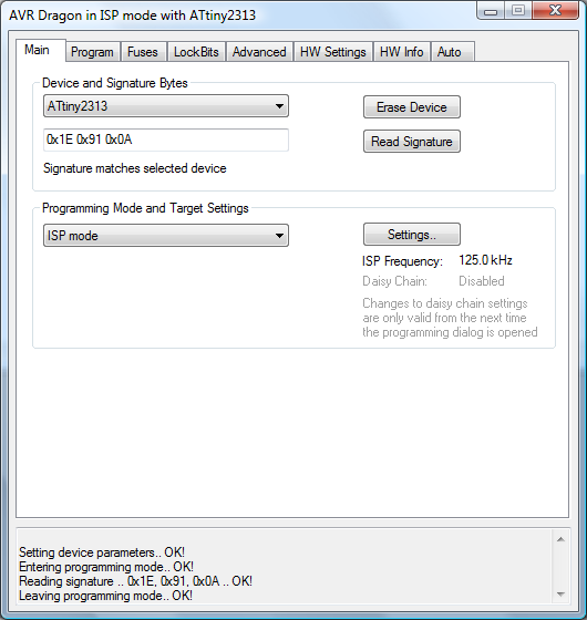 Um das Projekt zu compilieren, eine DOS-Eingabeauffoderung starten, in das firmware-Verzeichnis wechseln und "make" eintippen. Die resultierende attiny.elf-Datei kann folgendermaßen per AVR Studio und AVR Dragon programmiert werden: Zunächst den Dragon mit dem ATtiny verbinden. Dazu den ISP-Header per Pfostenstecker o.ä. verwenden. Die Pinbelegung ist auf der Rückseite des Dragons zu sehen, oder auch auf der Online Hilfeseite. Es müssen alle sechs Leitungen verbunden werden: