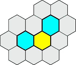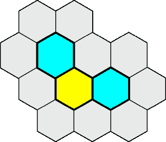 This is a totalistic cellular automaton on a hexagonal field with three colors. Totalistic means, that for calculating the next color, only the number of colors on the six neighbour fields are counted and the position is not considered. The ruleset for calculating the new color (result) is very easy: