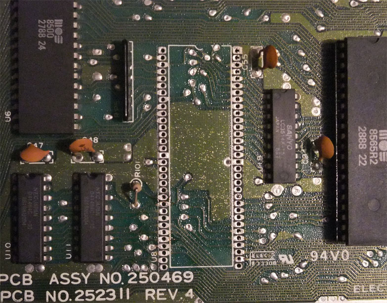 I've desoldered the PLA in the C64 with a ZD-987 vacuum desoldering station to remove most of the solder for each pin, and then heated up the residual solder with a AOYUE 998 hot air station which made it easy to remove the IC with a screwdriver and pliers. After cleaning the holes with some solder wick, the top of the C64 PCB looks like this: