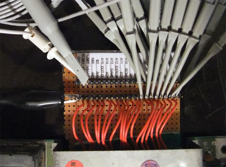 First there was a major hardware bug: The VIC requires to switch ma0-5 to input and ma6-7 to output, which is not possible with just one 8 level voltage level shifter as I planned it. Fortunately the RAM chips are working with the 3.3V output from the CPLD without voltage shifting. That's again the time when a hot air station is useful for desoldering the TSSOP voltage level shifter chip and a microscope for soldering some wires: