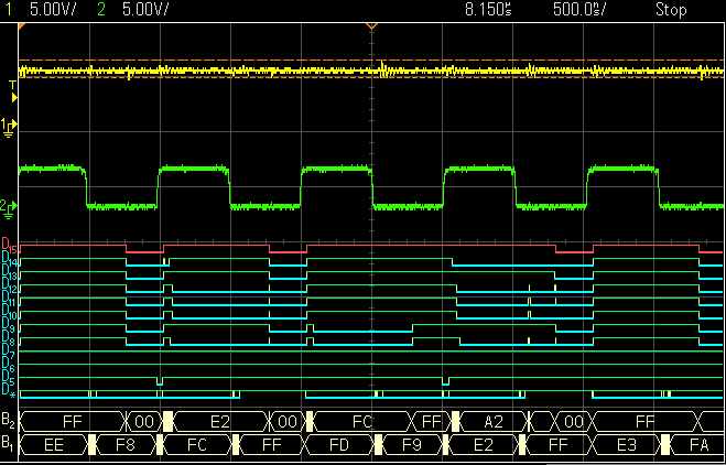 Bus B1 is the lower 8 bits of the address bus and bus B2 is the data bus. You can see that it reads the addreses $FFFC and $FFFD (the CPU accesses the bus always when AEC is 1), which reads the reset vector $FCE2 and then it jumps to it. The program at $FCE2 starts like this: