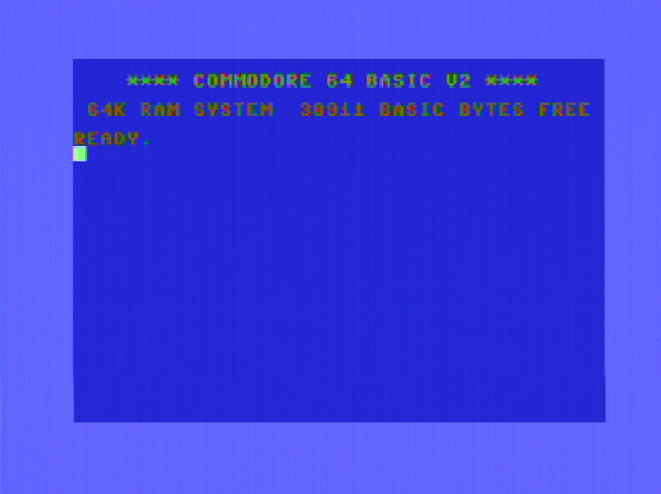 But it still didn't work, maybe because of problems with my implementation of the low-level implementation of the gates from the schematic entry design from the original Quartus project. So I rewrote it from scratch, but this time in high-level VHDL, which describes the ideas how CAS/RAS works for accessing the RAM and how the CPU and the VIC shares the address bus much better, at least for me as a programmer. The new source: c64pla_251715.vhd. With this code it booted and I could see the usual start screen. There were some minor problems, like that I forgot to select the color RAM when the VIC owns the bus, which caused a nice color animation on the startup screen like this: