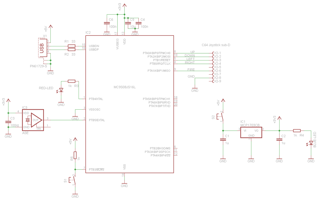 There are some nice emulators for vintage video games and computers out there, for example VICE for commodore hardware like the C64, but how do you connect old joysticks to your PC, like the Competition Pro (the original one, with 9-pin D-sub for an original C64, not the USB version) ? Most emulators provides joystick emulation with the cursor keys or other configurable keys. So this project is one solution for this problem: a Freescale microcontroller implements an USB keyboard and translates the up/down etc. buttons to keyboard events, like if you have pressed the cursor keys.