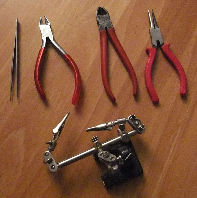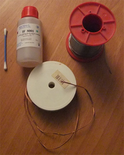 Consumption items for soldering: soldering flux, solder, and desoldering wire. A cotton bud is useful for applying the soldering flux.