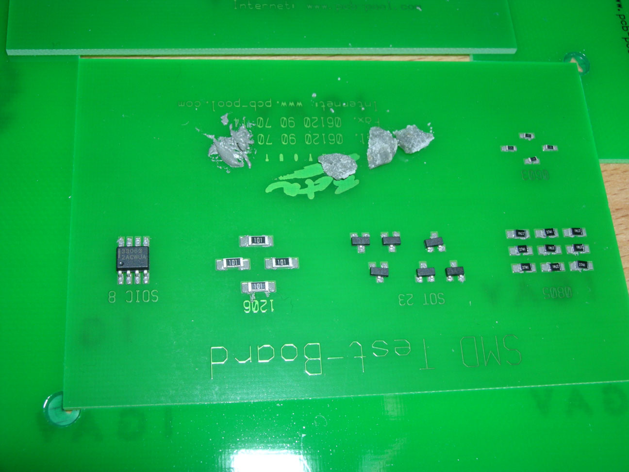 Alle Bauteile per Pinzette draufgelegt, zum Testen noch was Lötpaste so aufgetragen und ein paar Schmelzkreidestückchen.