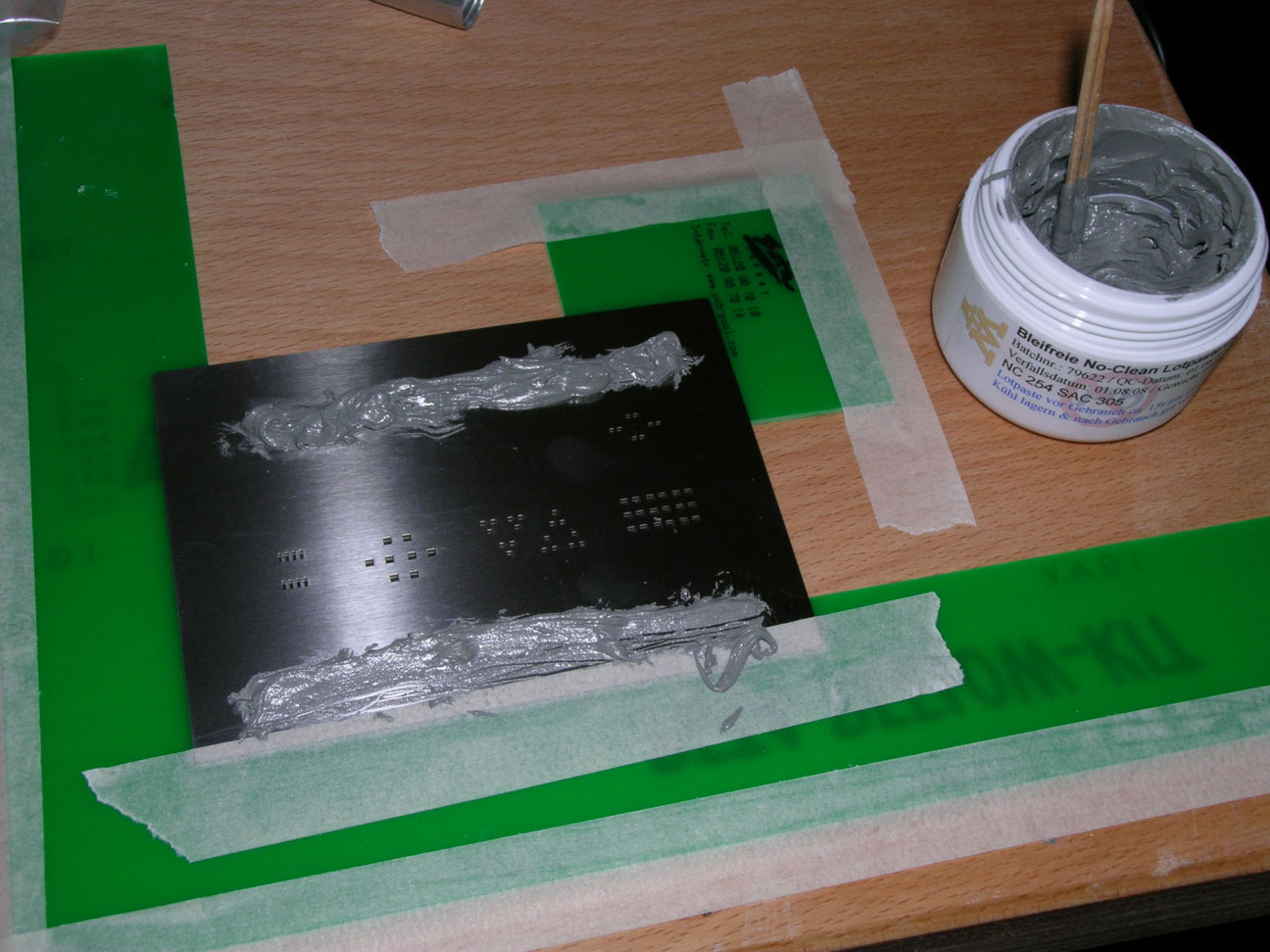 Lötpaste auf die Maske geschmiert (sollte eigentlich oben sein, hatte es erst unten aufgetragen).