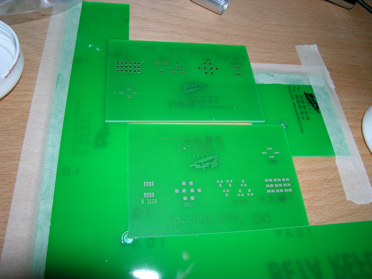 Mit dem Rakel genau einmal von oben nach unten drüberstreichen. Sieht dann so aus. Oberhalb zum Vergleich die Testplatine ohne Lötpastenauftrag.
