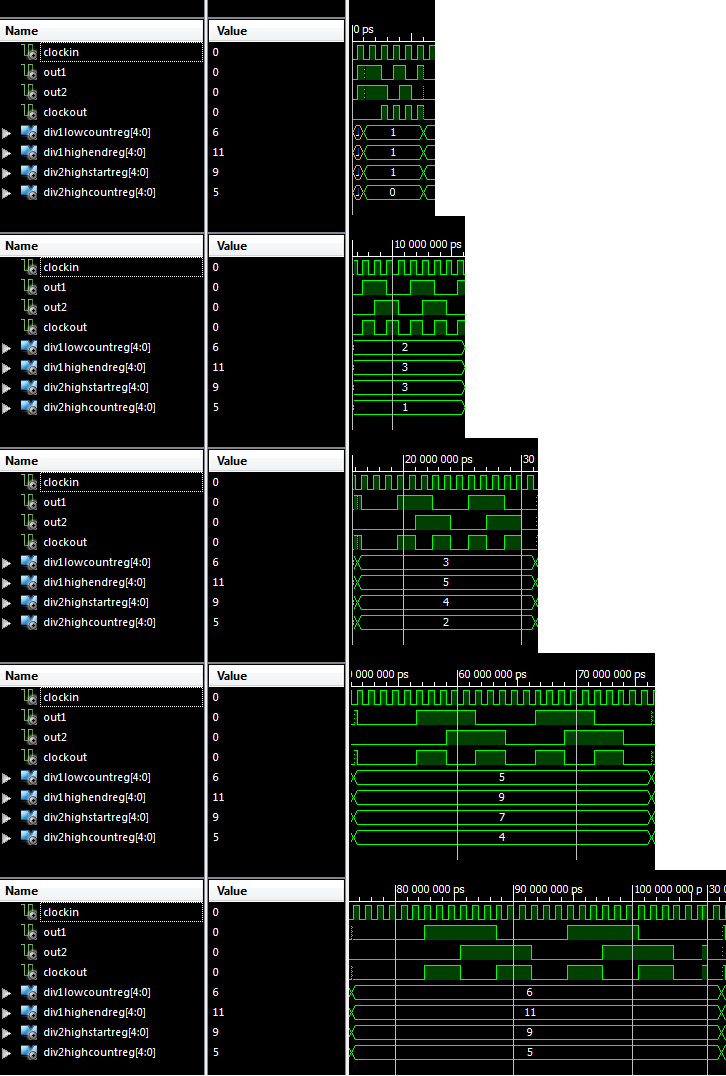 The testbench below demonstrates how to configure it to divide clockIn by 1, 2, 3, 4 and 5. Timing diagram: