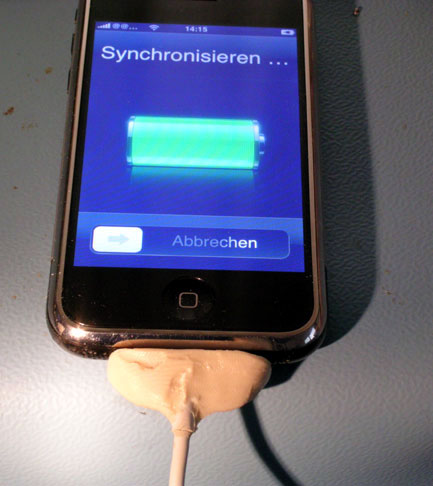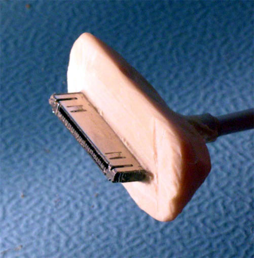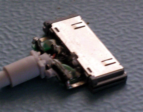 Auf der Suche nach einem seriellen Anschluss an meinem iPhone USB-Stecker habe ich das Plastik entfernt. Waren leider nur die notwendigsten Pins (USB und Stromversorgung) überhaupt vorhanden. Der Stecker sah nach der Prozedur so aus, lief aber noch: