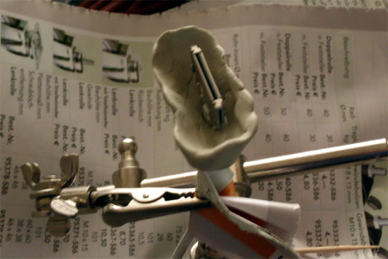 Um das wieder ein wenig stabiler zu machen, habe ich zunächst mit Knetgummi eine Form drumherum gebaut und in eine dritte Hand eingespannt :